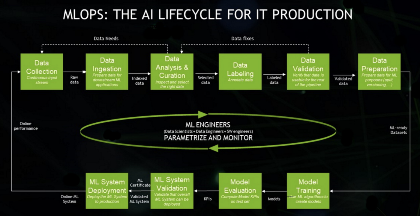 위 이미지에서 표현한 것과 같이 데이터를 수집하고 분석하는 단계(Data Collection, Ingestion, Analysis, Labeling, Validation, Preparation), ML 모델을 학습하고 배포하는 단계(Model Training, Validation, Deployment)까지 전 과정을 AI Lifecycle로 보고, MLOps의 대상으로 여긴다.