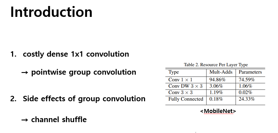 √ 계산비용이 많이 차지하는 1x1컨볼루션을 pointwise group convolution으로 대체하여 계산비용을 줄이겠다.