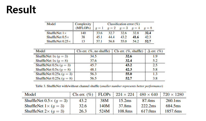√ channel shuffle의 유무에 따라 실험한 결과 있는 것이 성능이 좋게나온다.