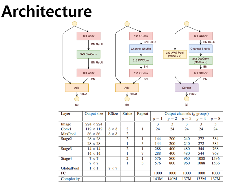 √ 전체적인 구조는 3x3 convolution과 맥스풀링으로 시작해서 shuffle unit을 반복하는 3의 stage를 지나 클로벌 풀링을 하도록 설계하였다.