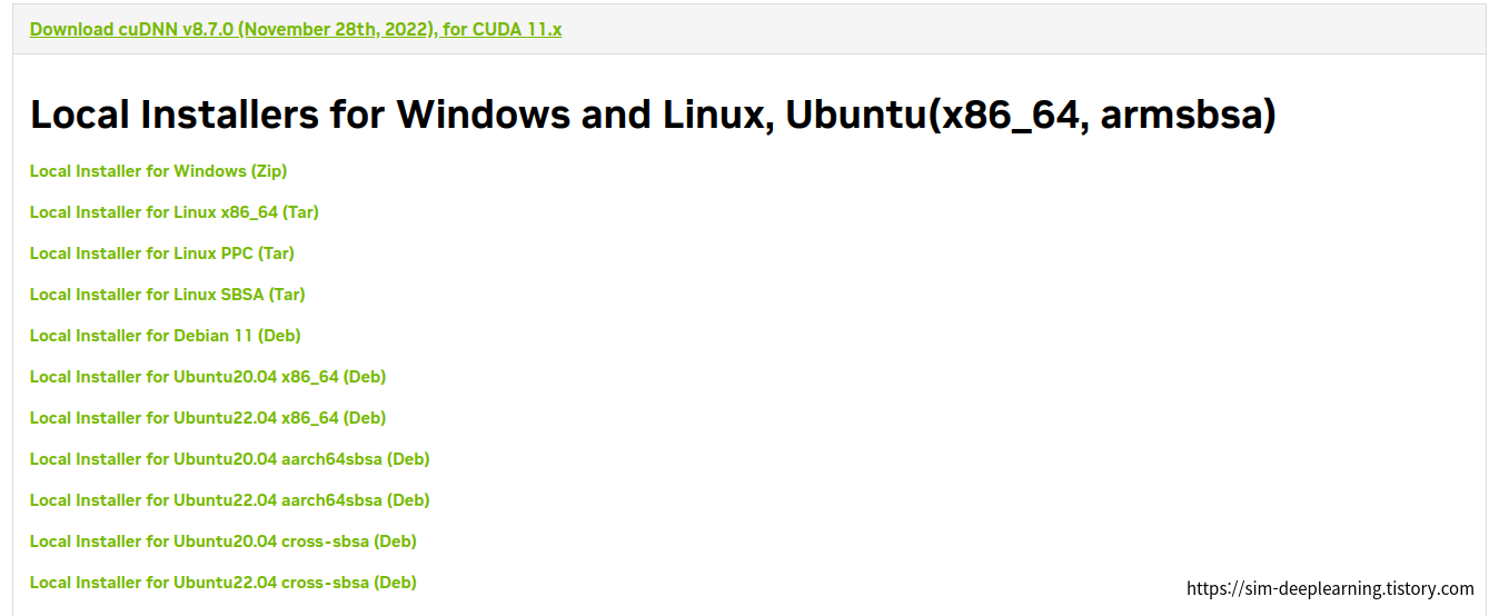 필자는 cuda 11.x 버전에 맞는 Cudnn 8.7.0을 선택