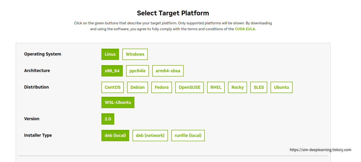 반드시 WSL-Ubuntu 선택하여 Installer Type에서는 deb(local) 또는 deb(network)선택하는 것을 추천함