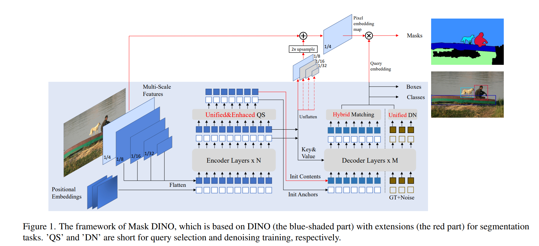 - Figure 1. 에서 빨간 라인으로 이어진 것이 DINO에서 추가된 Mask DINO의 segmentation design부분이다.